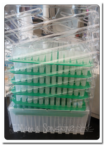 We really wanted some tissue paper pom-poms and decided to make some ourselves. We got some tissue paper packs from the dollar store, instead of separating the tissue paper by color we decided to make them rainbows too.