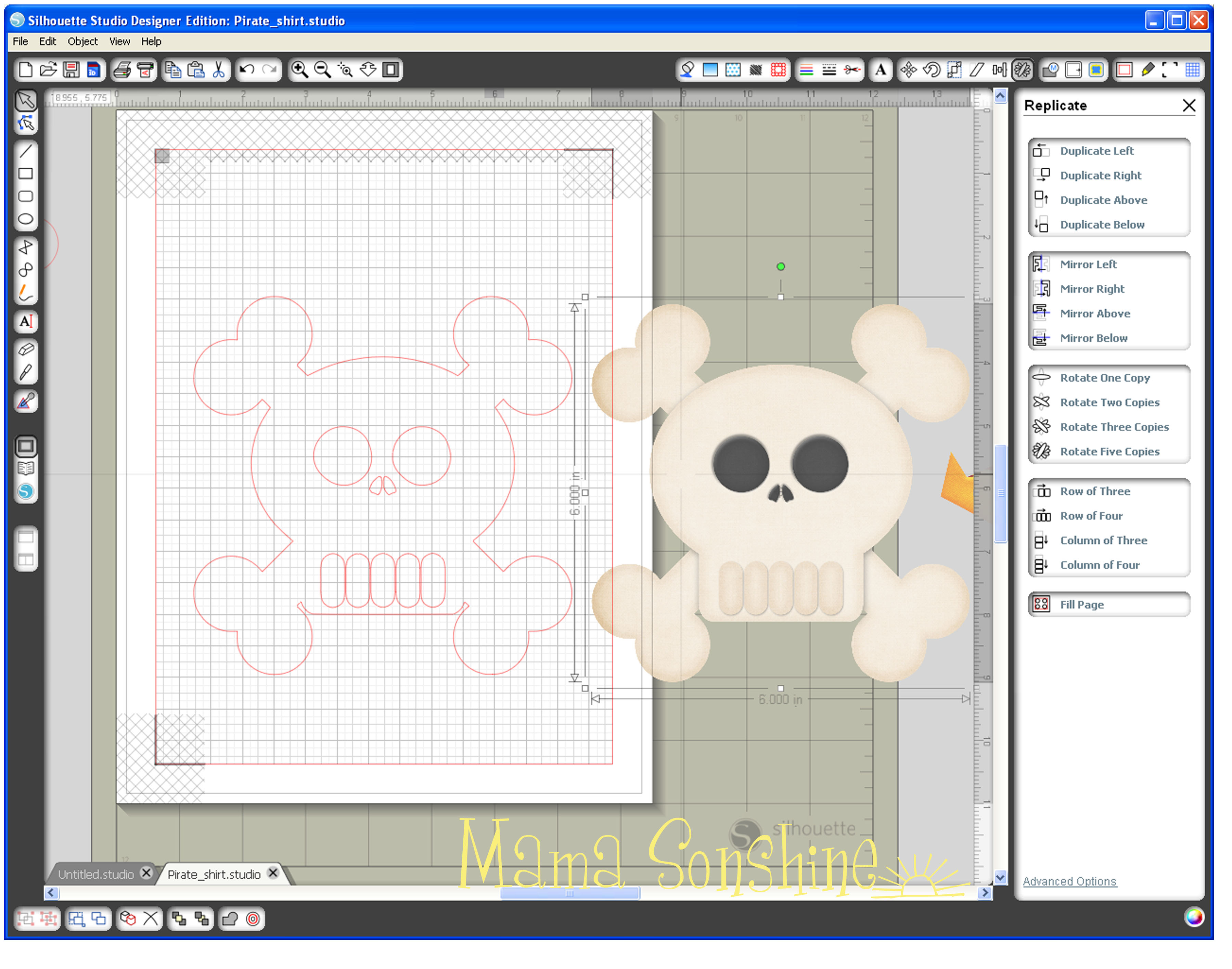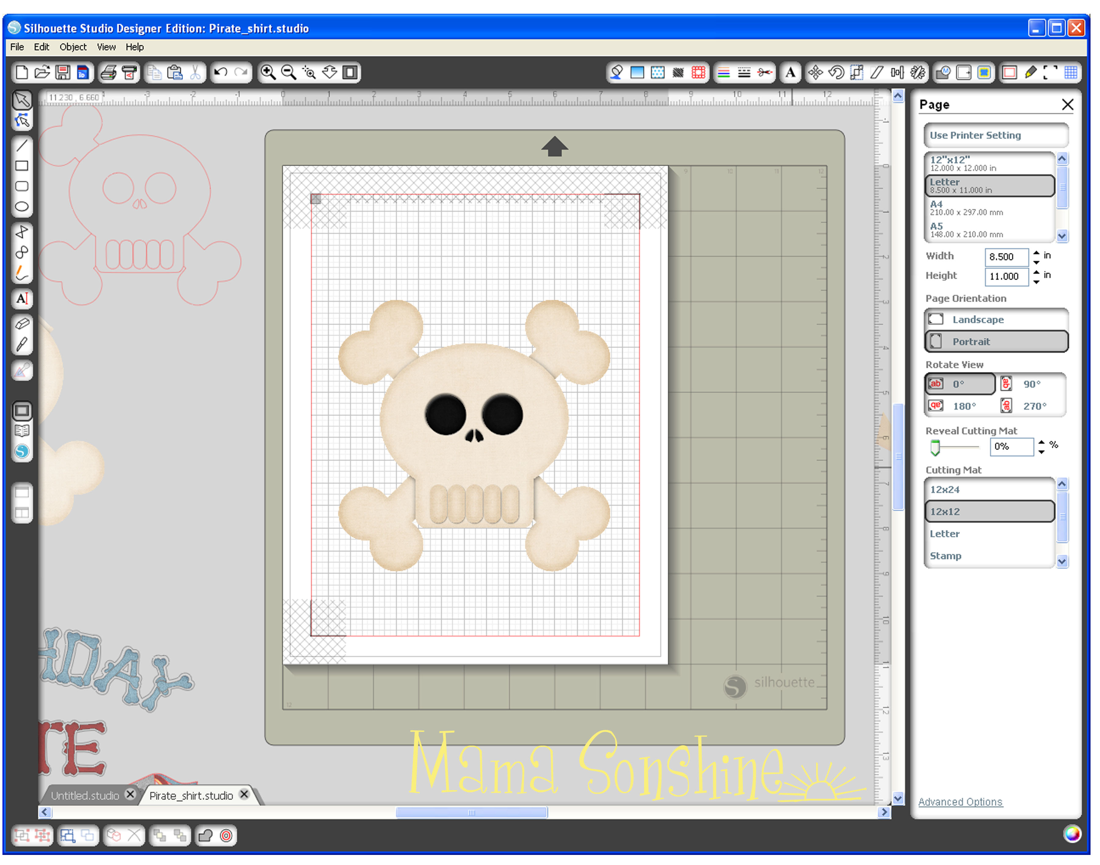 In the studio software I used the same file I had open for the skull & cross-bones because I needed the skull for a size and placement reference.  When I didn’t want it on the screen I simply moved it off the mat.