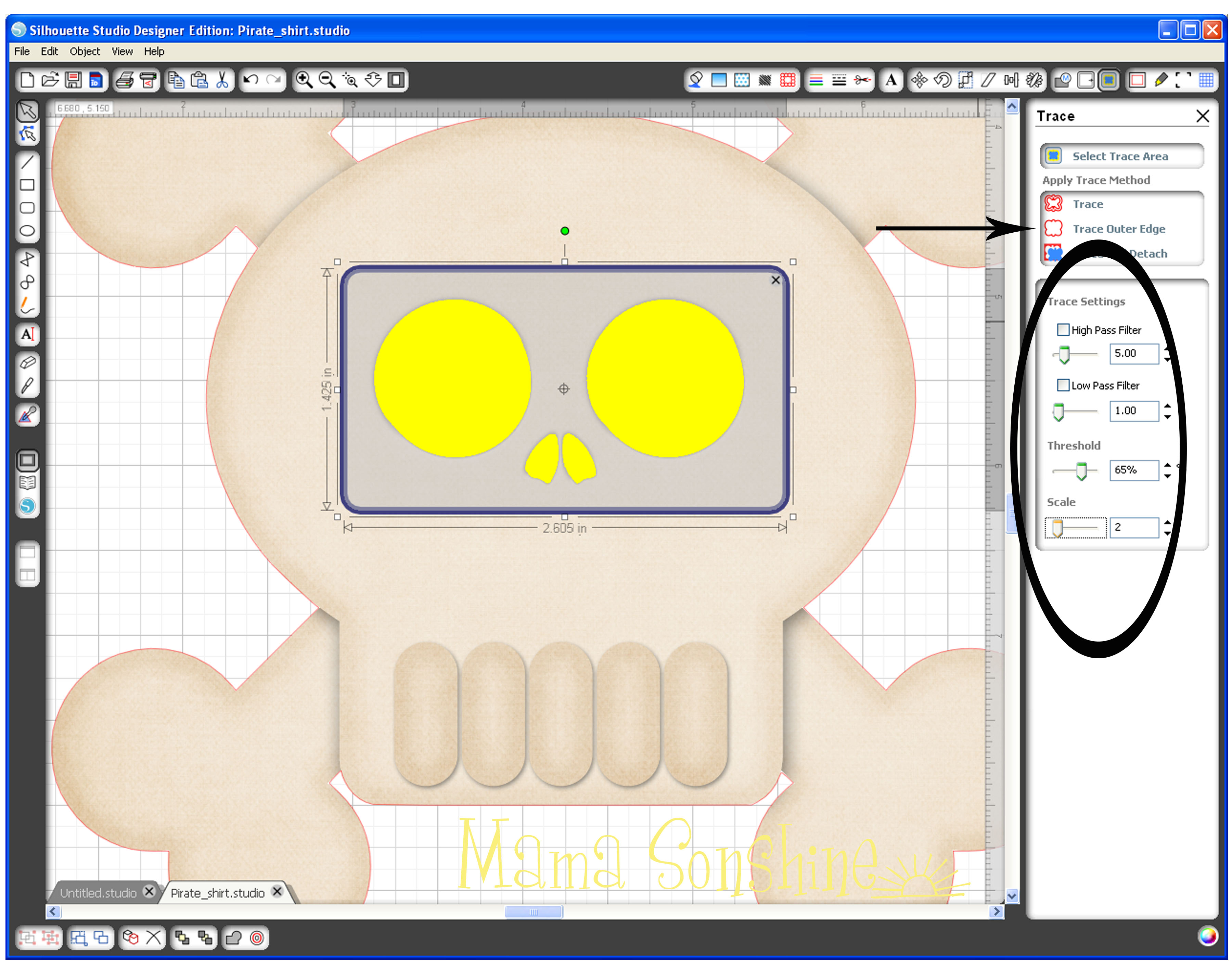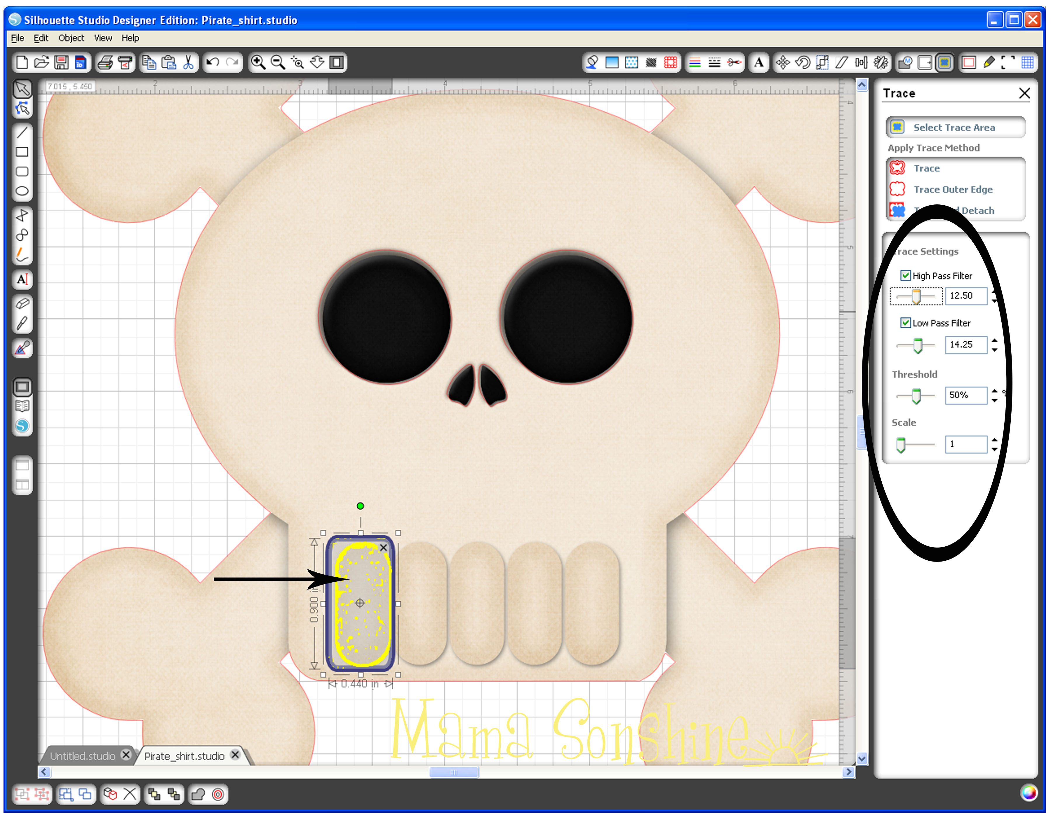 MSS_PirateShirt_Tutorial02No matter what my settings were, I could not get the eyes, nose and teeth to be traced.  This is because they are colored parts of the png, so the software couldn’t differentiate between them and the skull.  I chose to trace the outline first, then do the inside elements separate.