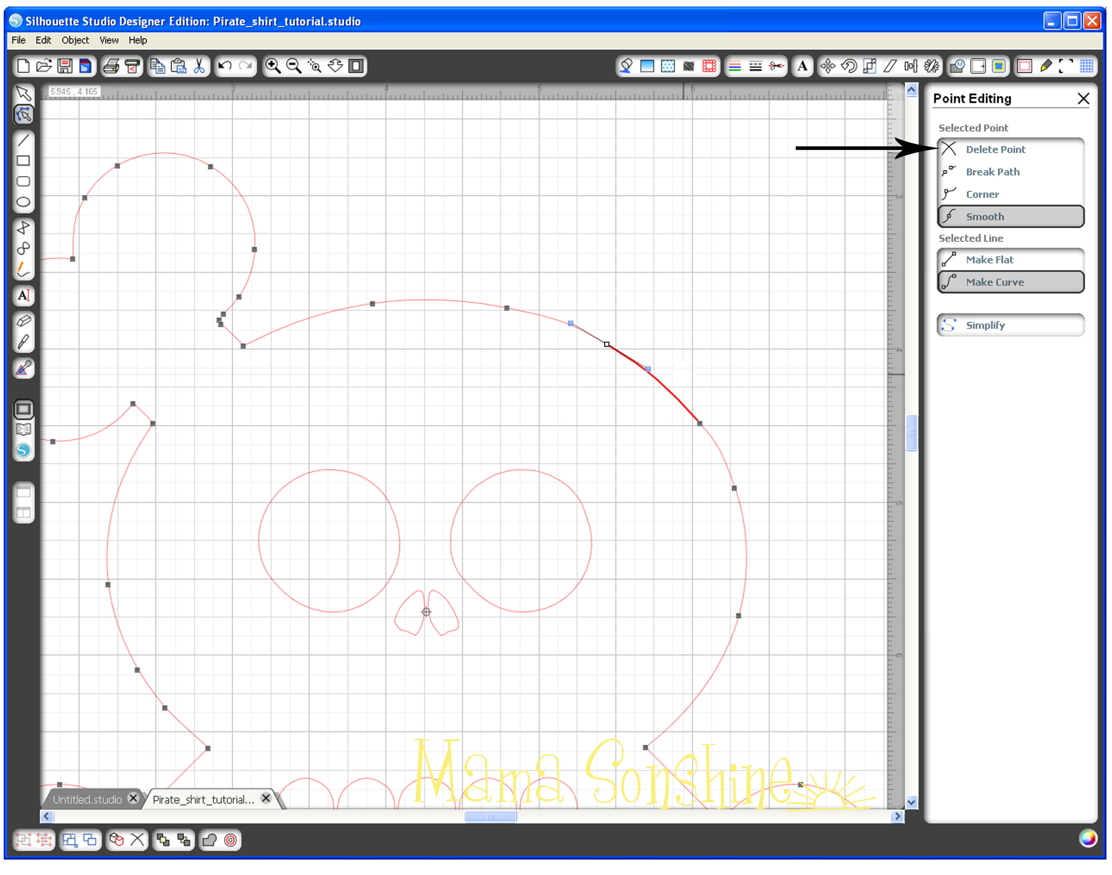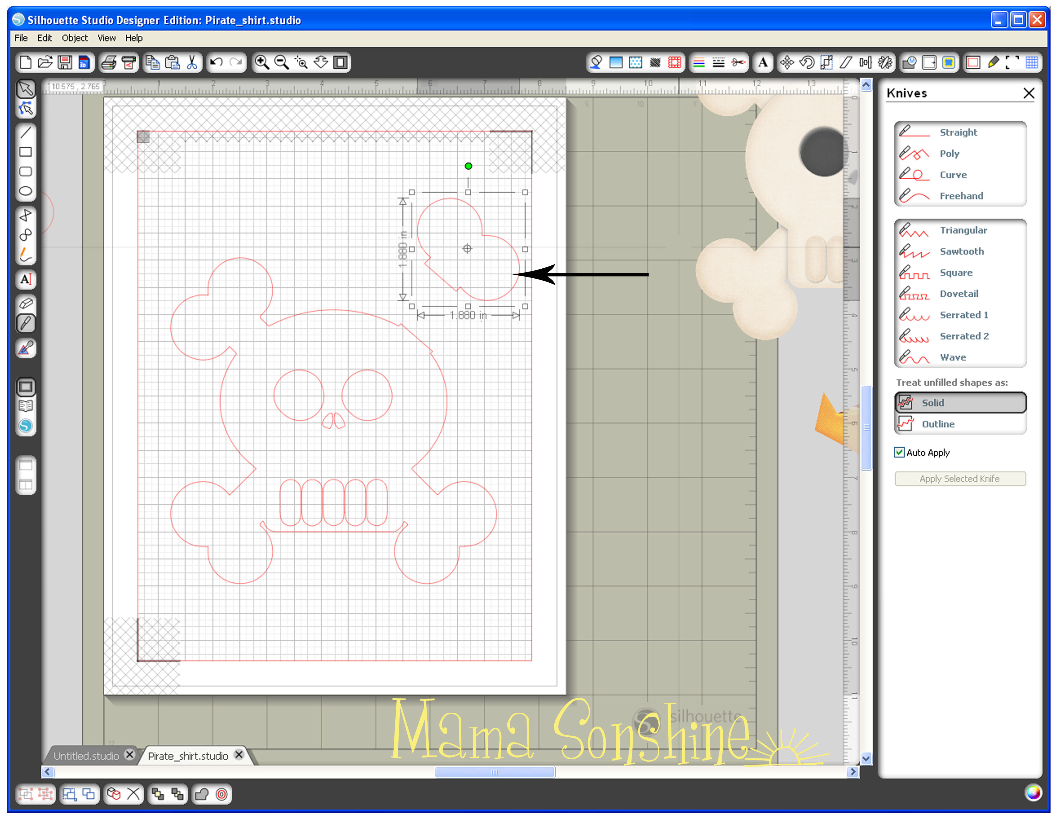MSS_PirateShirt_Tutorial11In the cut style tool box make sure “cut” is selected so that it also cuts out the eyes, nose and teeth.  The shirt will show through on these parts.