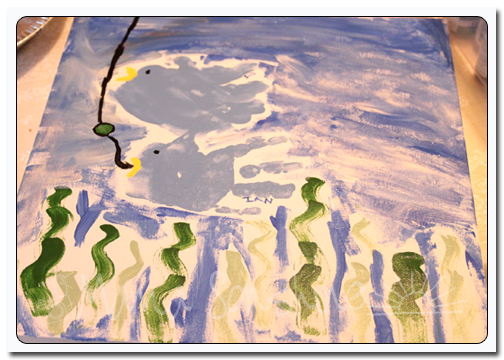Since Ian went on his first fishing trip with his dad recently, I thought it would be perfect.  Plus I could add Baby Sid’s hand print as another fish.