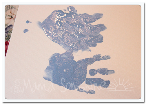 My mom helped me with Baby Sid’s hand print, but I should have waited until he was asleep.  Cause his is the one on top and it looks bigger than Ian’s.