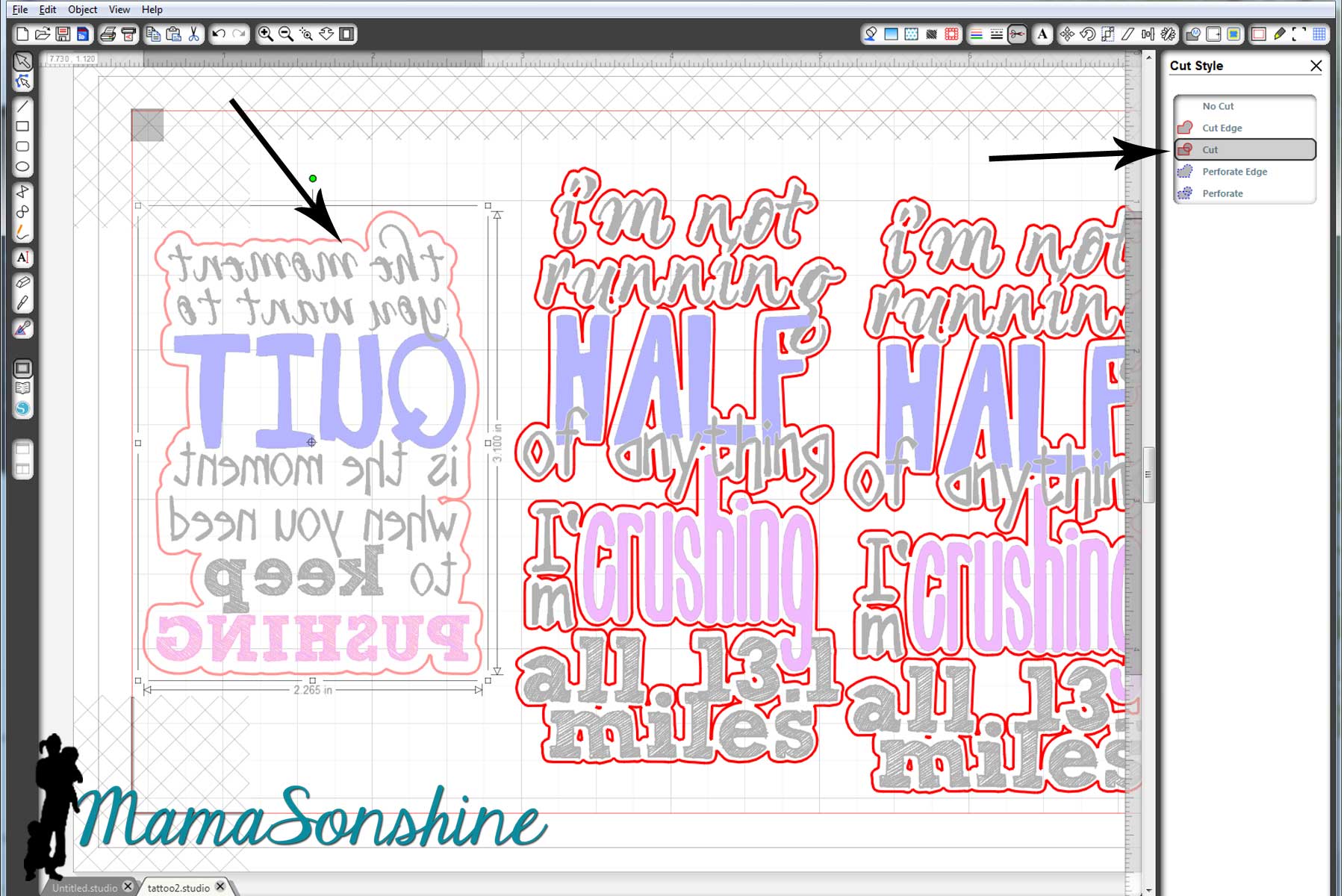 I sized out the space on my arm and made a box in Silhouette Studio. I then typed out my sayings and changed the fonts, sizes and colors for specific words. I then used the offset tool to create my cut lines around the words. Remember, anything that is white in your design will be clear on the tattoo, and your skin will show through.