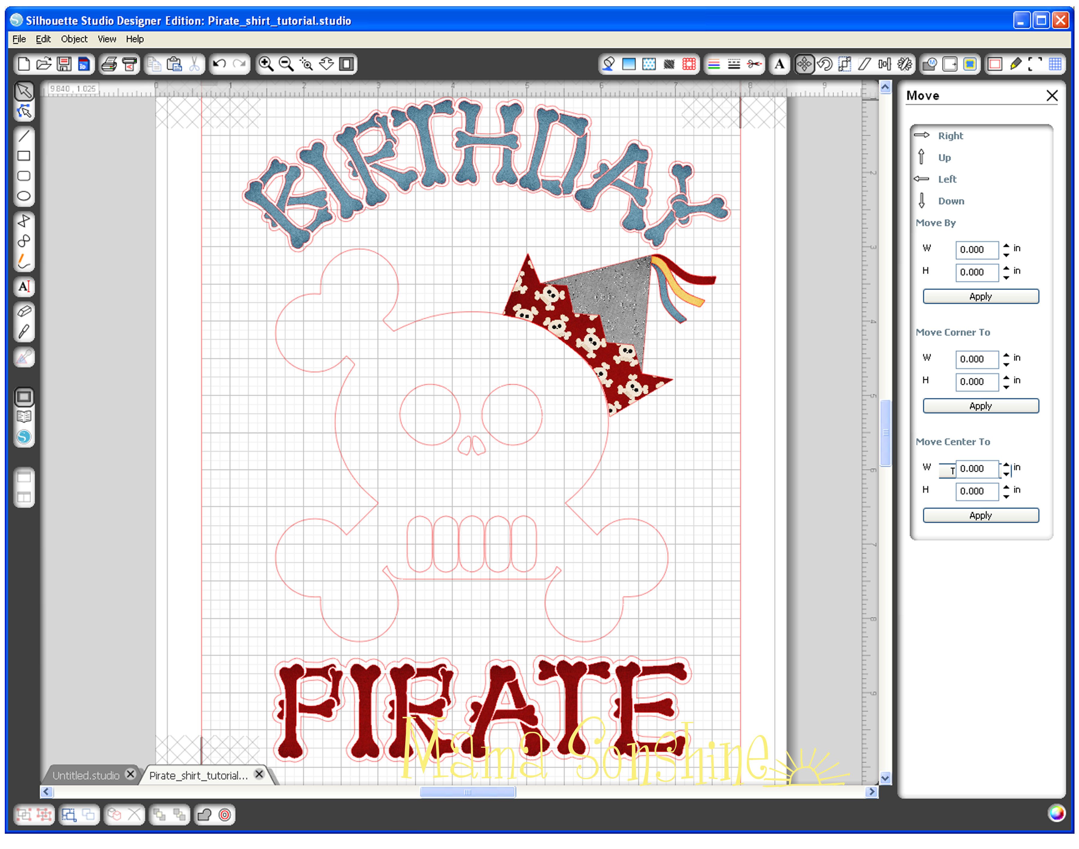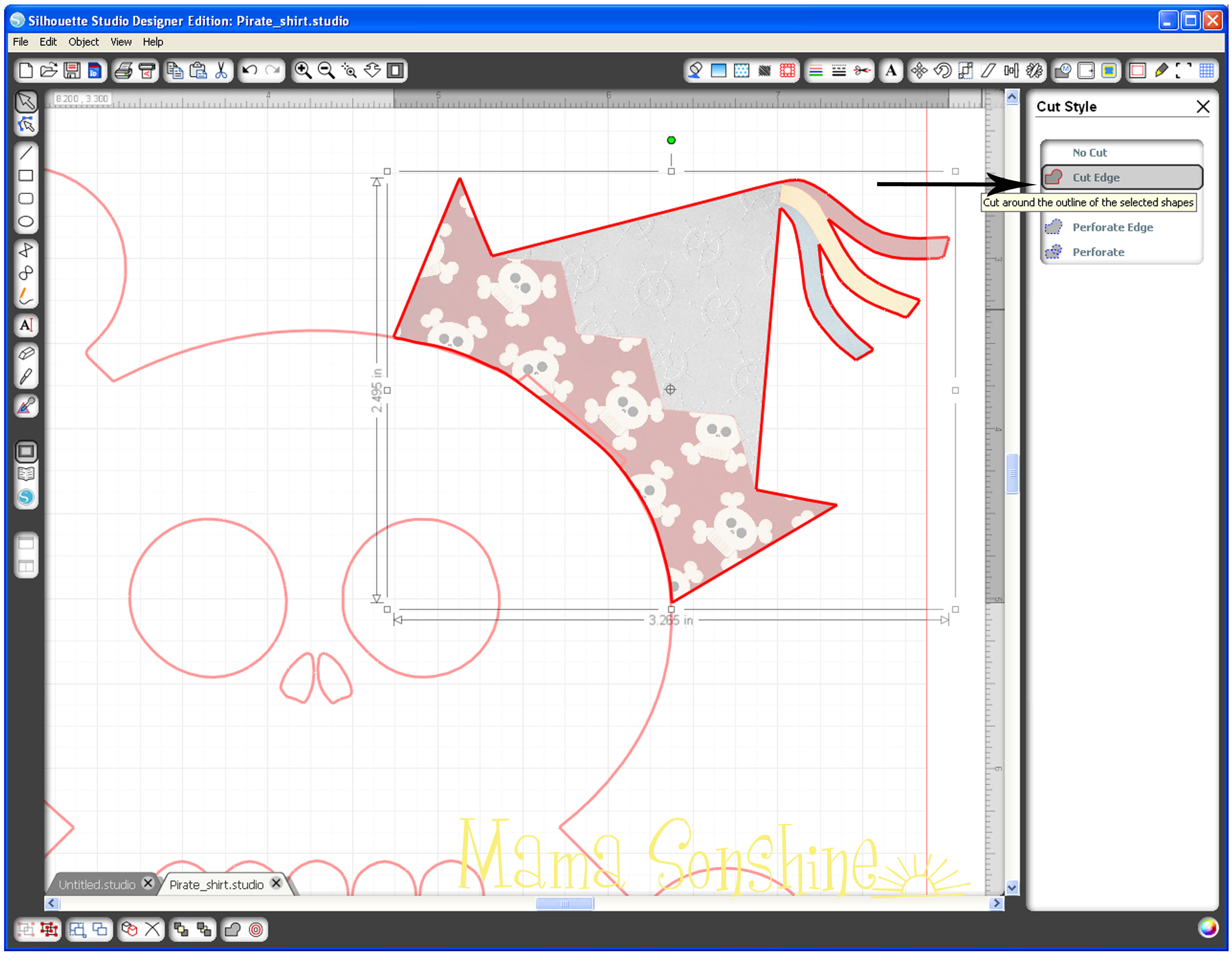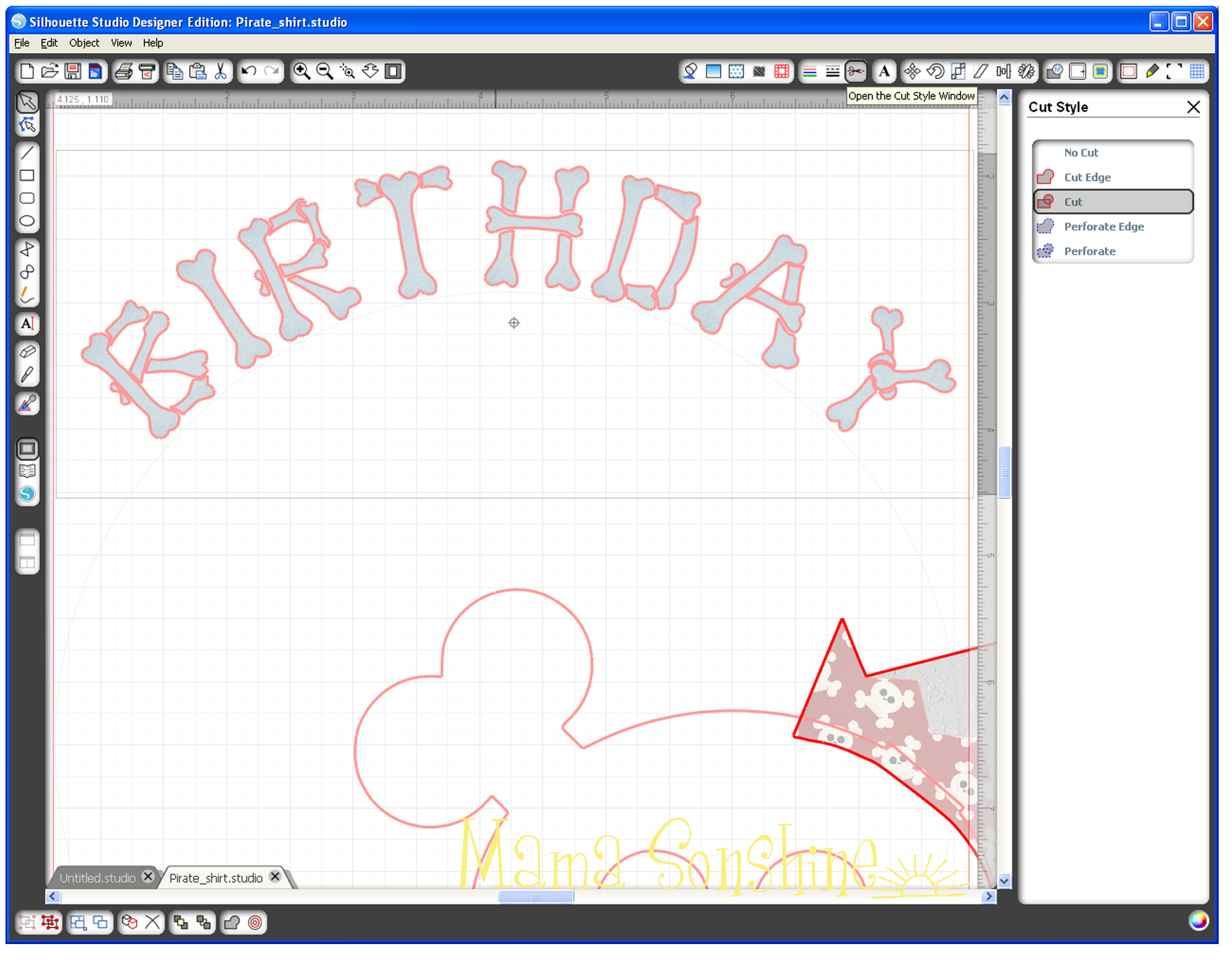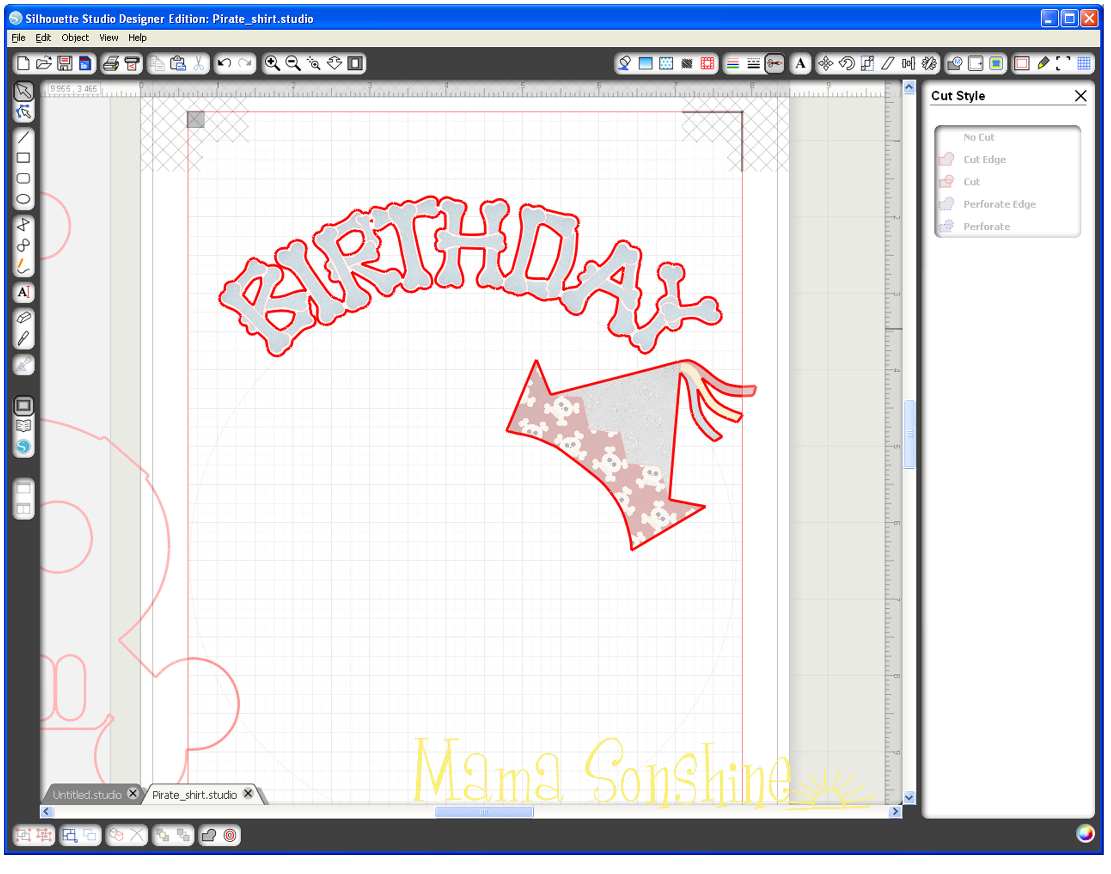 In the studio software I used the same file I had open for the skull & cross-bones because I needed the skull for a size and placement reference. When I didn’t want it on the screen I simply moved it off the mat.